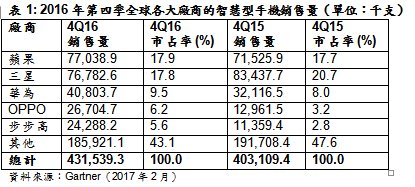 國際研究暨顧問機構Gartner表示,2016年第四季全球智慧型手機對終端使用者銷售量(以下簡稱智慧型手機銷售量)總計4.32億支,較2015年第四季增加了7%。蘋果(Apple)也在2016年第四季超越三星(Samsung),拿下全球智慧型手機龍頭廠商寶座(見表1)。