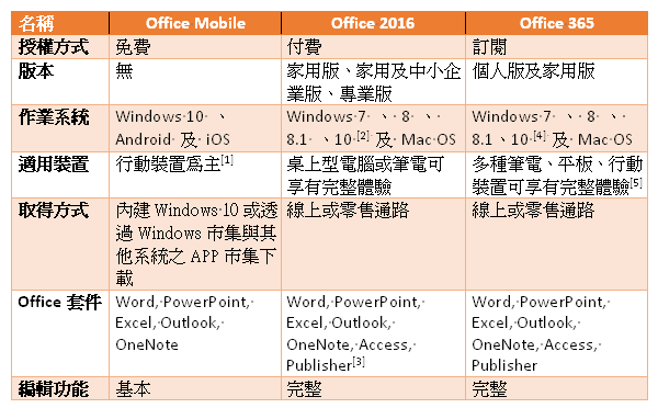 - 有鑑於行動裝置之普及化,為滿足行動工作者之需求,「 Windows 10 將搭載Office Mobile 」,讓使用者能隨時隨地瀏覽文件。 10.1吋 (含) 以下行動裝置所搭載之 Office Mobile ,除瀏覽功能外,另具備基本的編輯功能,讓使用者在行進之間,也能快速回覆資訊;10.1吋以上的裝置所搭載之 Office Mobile 僅有瀏覽功能,建議另外購買 Office 365 或 Office 2016 ,擁有完整編輯功能。