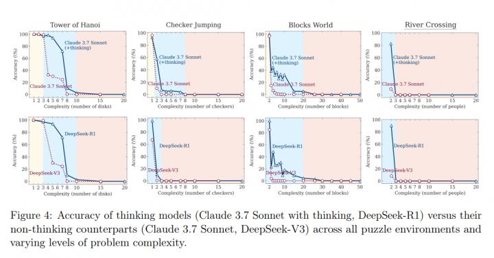 圖 4(原論文)展示四謎題的整體正確率曲線。以 Claude 3.7 系列為例:在河內塔,非思考版在 N = 3 仍保持 99 %,Thinking 版約 92 %;