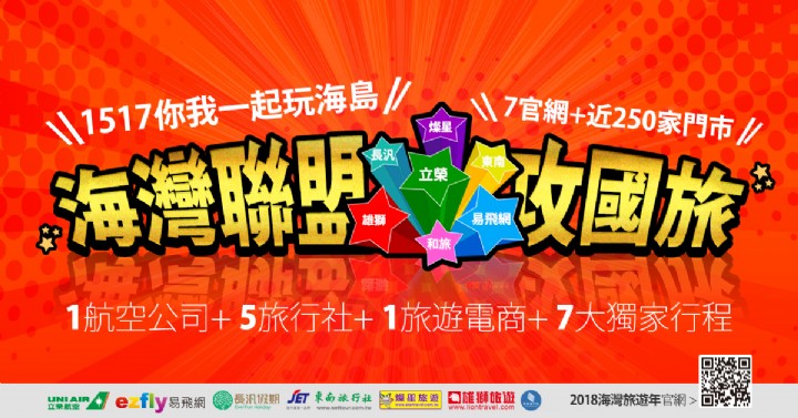 易飛網ezfly不甘國旅市場持續低迷,同時響應交通部觀光局2018海灣旅遊年政策,近期整合旅遊產業上、中、下游龍頭企業,在國內航線最綿密的立榮航空鼎力支持下,於今(5/14)宣布結合5家旅行社共組「海灣聯盟」,即日起至12月31日推出「立榮假期7大島嶼獨家行程」,「復仇價」2天1夜機+酒僅4,899元起,並同步於線上7大官網入口、及線下近250家實體店面進行大串連,力拼7個月內達成「海島復仇旅遊」7,000人次目標,邀請國人「1517你我一起」玩海島!