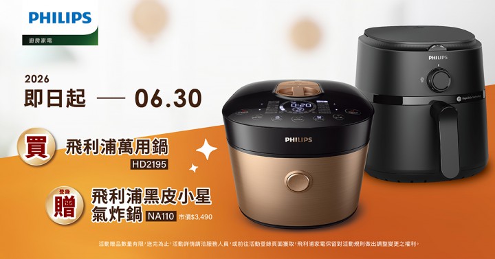 同時,對於居家料理有極致追求的家庭,還有更進階的全能廚房提案:即日起至 6 月 30 日止,於指定通路購買深受消費者喜愛的經典商品「飛利浦雙重脈衝智慧萬用鍋 HD2195」(金小萬),並於 7 月 5 日前完成發票登錄,即贈限量好禮飛利浦黑皮小星氣炸鍋(NA110)。數量有限,送完為止。快把握難得機會、讓每道理想中的料理,都在自家廚房完美呈現 。