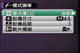 在拍攝選單中,用戶可選擇 P 模式或 光圈優先模式。不過光圈只有兩段調整(模式轉盤的 M-mode 光圈也是兩段調整, 但快門則可在 8sec ~ 1/1000sec 中自由選擇):