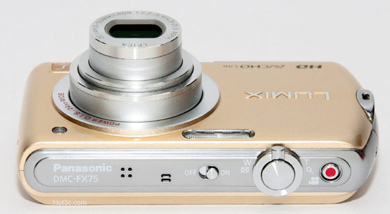 FX75 與大部分 Panasonic 薄型隨身機種外型並無太大差異,不過 FX75 機身厚度只有 2.28cm,也堪稱口袋機種。機械式的電源開關,保有 Panasonic 傳統。機頂也另外只有變焦/快門按鍵以及錄影鍵: