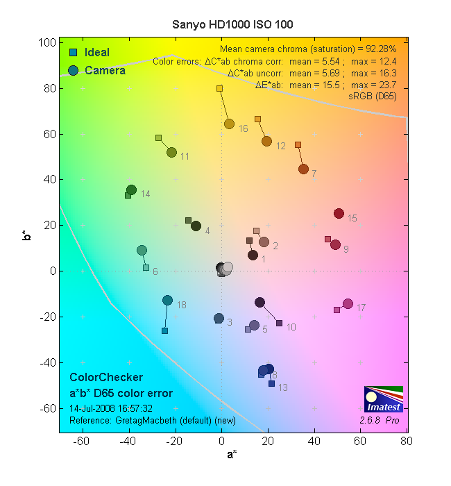以下是 HD1000 的色彩傾向分析。 可看到紅色、藍色系均相當標準,但黃色系偏淡,如此一來,色彩感覺會較為偏暗。