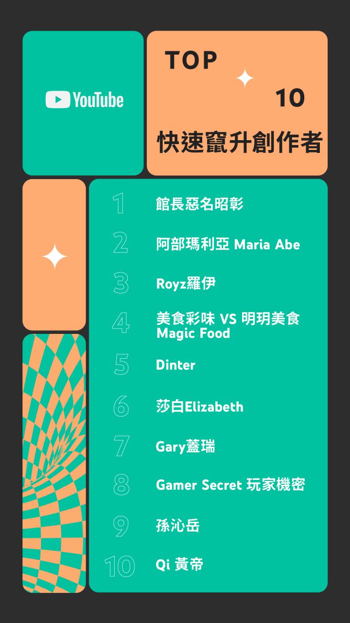 YouTube 豐富多元的內容也反映在「快速竄升創作者」榜單中,今年ACG內容 (動畫Animation、漫畫Comic、電玩遊戲Game)和外籍創作者頻道的訂閱數快速成長。 「Dinter」、「Gary蓋瑞」等四個電競遊戲頻道透過實況直播、留言等互動形式,促進觀眾即時參與,並營造出連結更加緊密的同好社群歸屬感 ;而隨著 2021 年台灣觀眾觀看動漫影片的時間相比去年同期大幅成長,創作者「孫沁岳」也以詳盡、有趣的動漫分析在榜上有名。來自日本的「阿部瑪利亞 Maria Abe」和美國籍的「莎白Elizabeth」在疫情下帶領觀眾線上體驗跨文化的生活和觀點,分居榜單第二、六位。