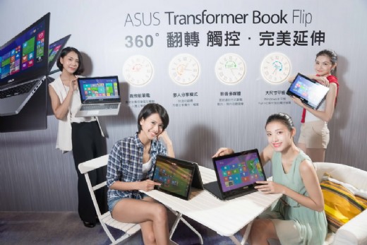 華碩推出最新變形筆電系列ASUS Transformer Book Flip觸控變形筆電,獨家創新無段式4齒輪軸承設計,可360〫全方位直覺翻折4大使用模式,依照全日每個不同時段需求靈活運用,輕鬆玩轉於高效筆電以及Window 8主流平板之間。4大使用模式包括:具備流暢觸控軌跡板與人體工學鍵盤的「高效能筆電模式」;可快速翻轉分享文件、圖片檔案的「多人分享模式」;以及提供使用者更舒適地聆聽音樂、觀賞影片、照片的「影音多媒體模式」;還有支援Windows 8作業系統的Full HD高解析度「大尺寸平板模式」,使用者可一機多用,無論上班時間的辦公會議、下班之後的居家生活,還是假日的戶外休閒、社交分享,皆能因時因地、隨心所欲選擇完美角度一覽精彩視界,享受無與倫比的極致行動力,豐富個人數位新生活。