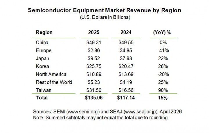 【2026年04月13日–新竹訊】 SEMI國際半導體產業協會日前公布「全球半導體設備市場報告」 (WWSEMS;Worldwide Semiconductor Equipment Market Statistics)。報告指出,2025年全球半導體製造設備銷售總額達1,351億美元,較2024年的1,171億美元成長15%。此一成長主要受惠於先進邏輯、記憶體,以及AI相關產能持續擴張所帶動。
