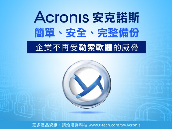 近日勒索軟體肆虐網路,加密惡意軟體透過夾帶附件的電子郵件或被惡意軟體植入的網站進行傳播與攻擊,針對已感染電腦的重要資料進行加密並要求支付贖金,中大型企業或政府組織往往成為使用加密惡意軟體攻擊的網路犯罪者的最佳目標,企業內部多台電腦的機敏資料被加密並勒索,進而蒙受智慧財產權與業務的損失。Acronis安克諾斯獲獎無數的磁碟影像技術僅需一個簡單步驟,即可儲存磁碟或磁碟區的完整影像 (其中包含作業系統、應用程式和資料),無論企業使用實體或虛擬作業系統,皆能完整兼容,擷取、儲存、復原控制及存取資料到任意裝置、平台、雲端及行動環境中,確保企業營運順利運作、增加整體效能,是企業資料安全備份、災後復原的最佳首選。